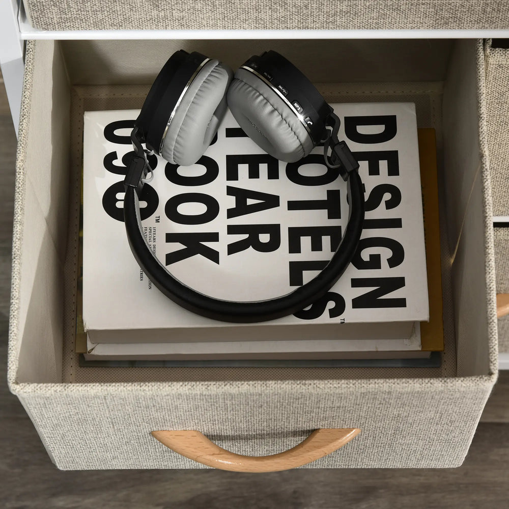 - Linen-feel drawers can be removed and folded. Comes with handle to open and close