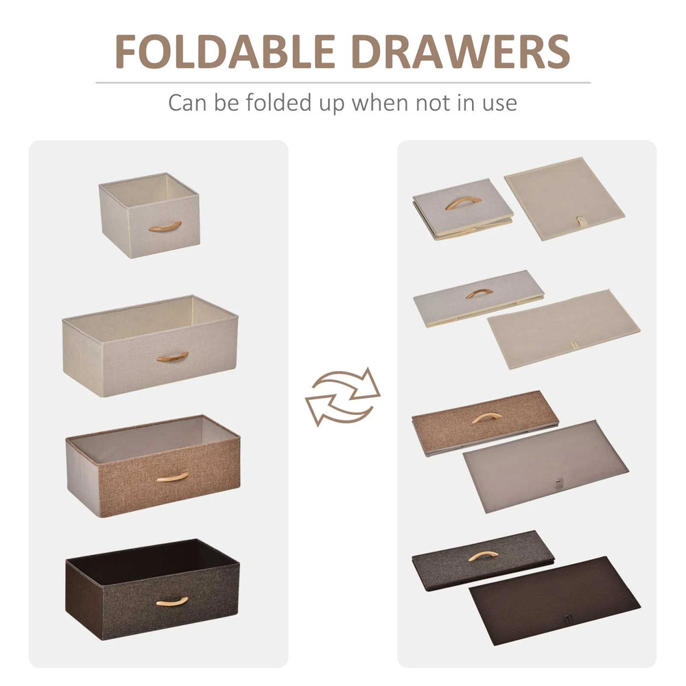- FOLDABLE DRAWERS: This drawer unit features 5 foldable drawers. Drawers are made of breathable lien fabric which is easy to clean. Handles make opening and closing simple. The fabric drawers can be folded when not in use. You can place the dresser in the closet, bedroom or corner