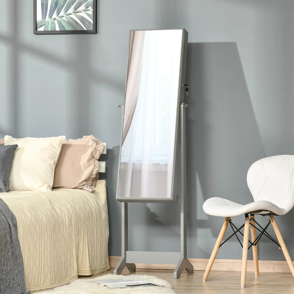 HOMCOM Full Length Mirror with Storage, Jewellery Cabinet with Mirror, Adjustable Angle and Stand, Lockable Jewellery Organiser for Bedroom Dressing Room, Grey