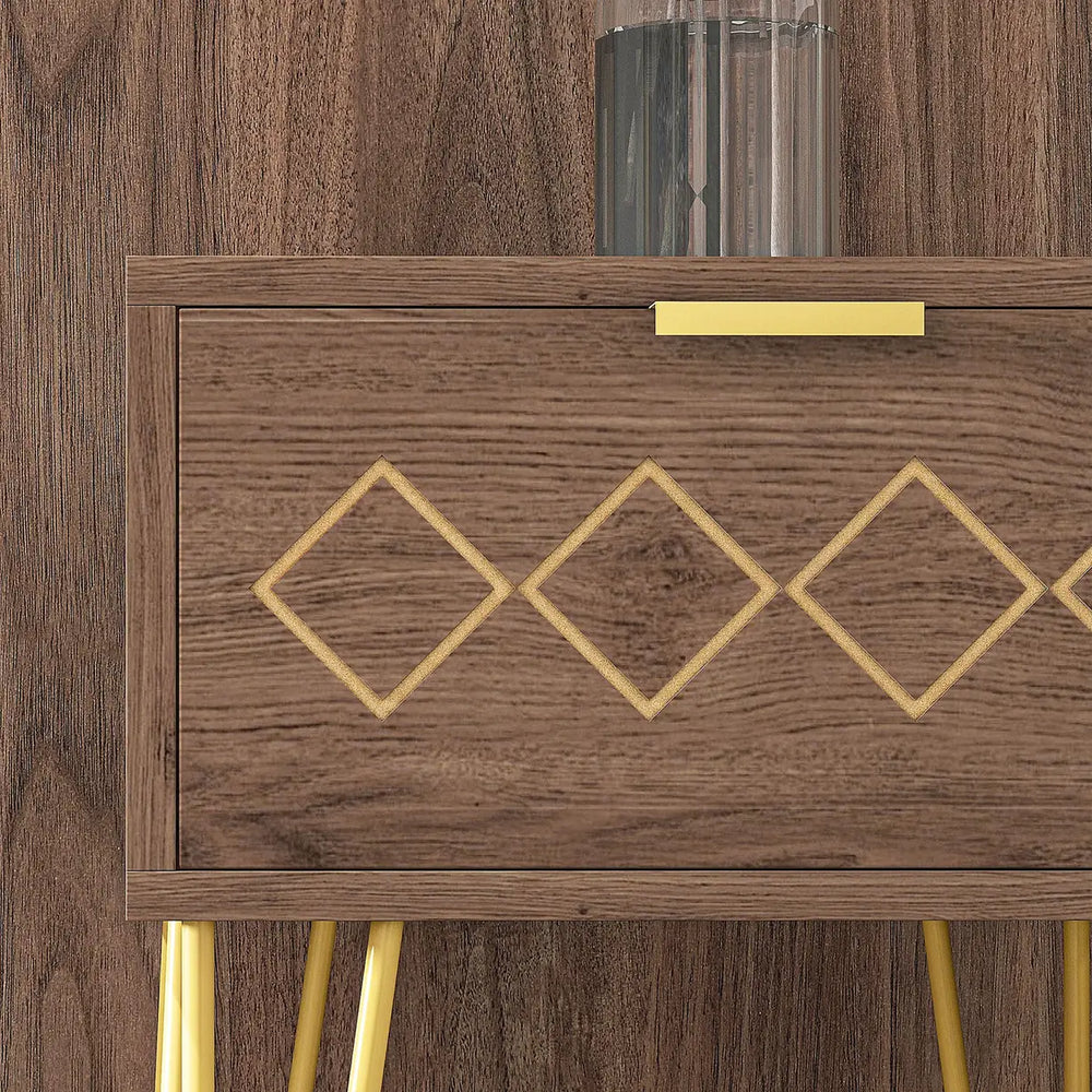 - Classic and luxe mix design: Boxy bedside table comes in a faded wood effect, with gold-coloured details for the handle, front diamond-shaped pattern and hairpin legs. A beautiful design.