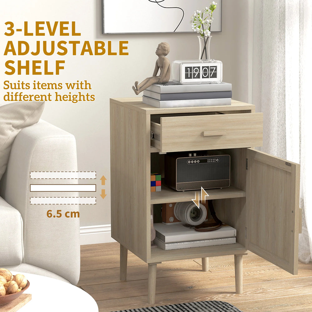HOMCOM Bedside Table Set of 2, Rattan Side Tables with Drawer, Cabinet and Adjustable Shelf, Boho Bedside Cabinet with Storage for Bedroom, Living Room, Natural Wood Effect
