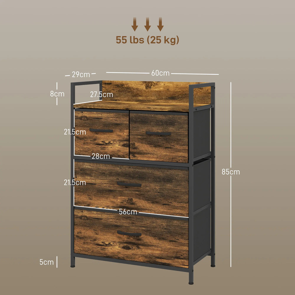 HOMCOM Rustic Chest of Four Fabric Drawers - Rustic Brown