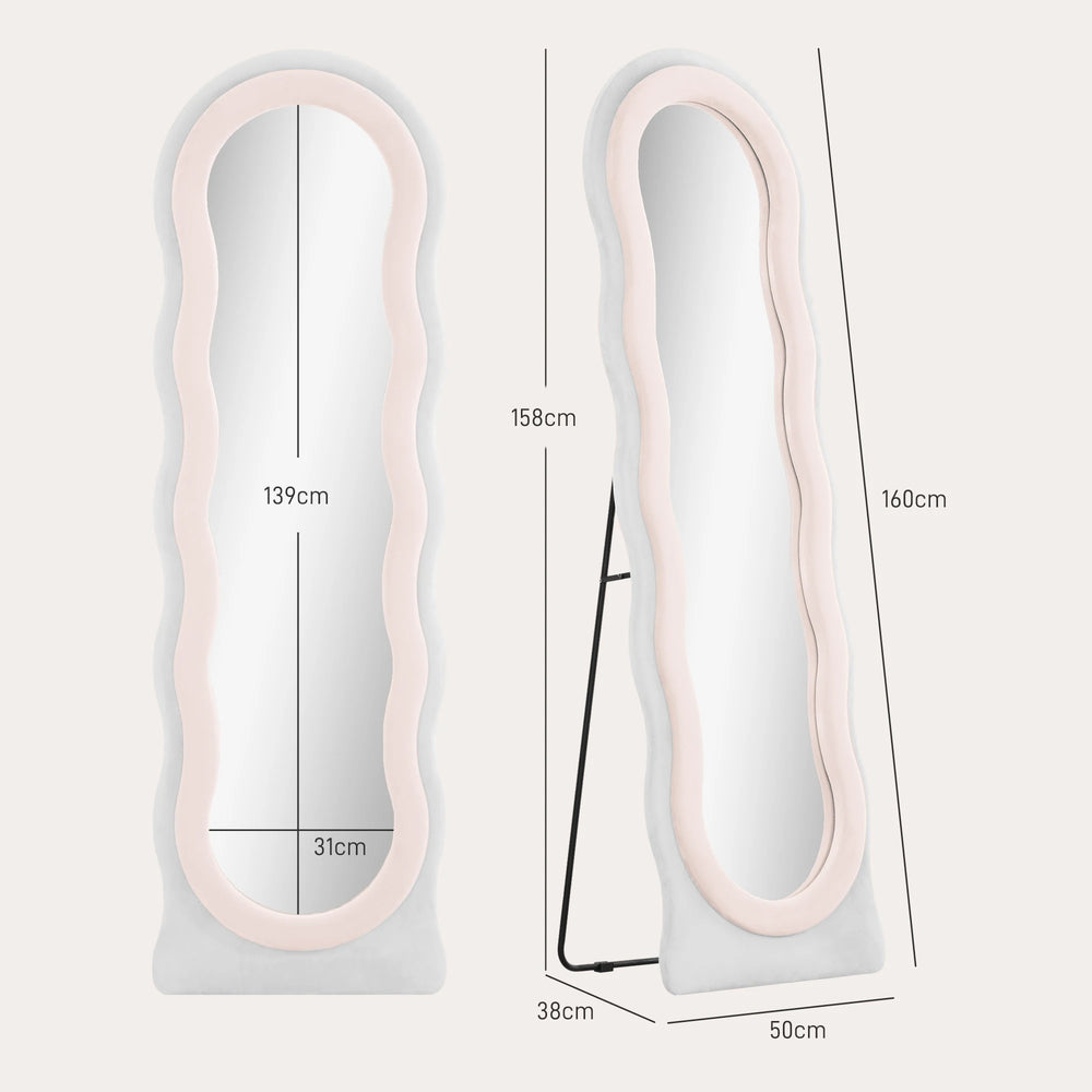 Fun and funky, this HOMCOM wavy mirror creates a statement in your home and beyond. The wavy shape, block colour and velvet-feel finish of the frame all work together to give it a bold, retro look; let the standing mirror work alongside your furniture, or give it a place which allows it stand out and command attention forever more. Thanks to the full length and thick glass, you can see yourself fully and clearly: you'll be leaving your home confidently forever more.