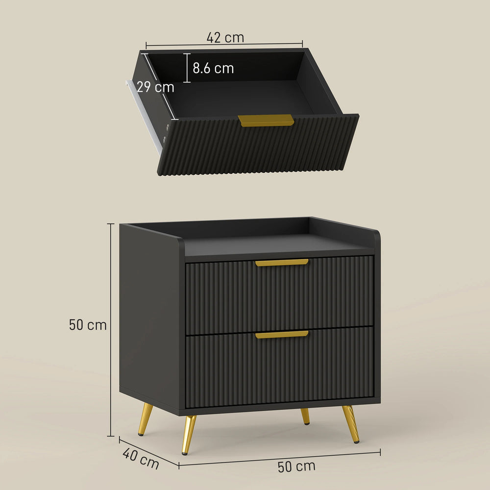 A bedroom essential, in bold and elegant style with this HOMCOM nightstand. The ridged drawer fronts and gold tone handles add a beautiful touch to the solid colour. With two drawers and a flat tabletop, with safe low-rise walls, there's lots of storage for bedtime essentials and more. Complete with a metal legs for strong support.