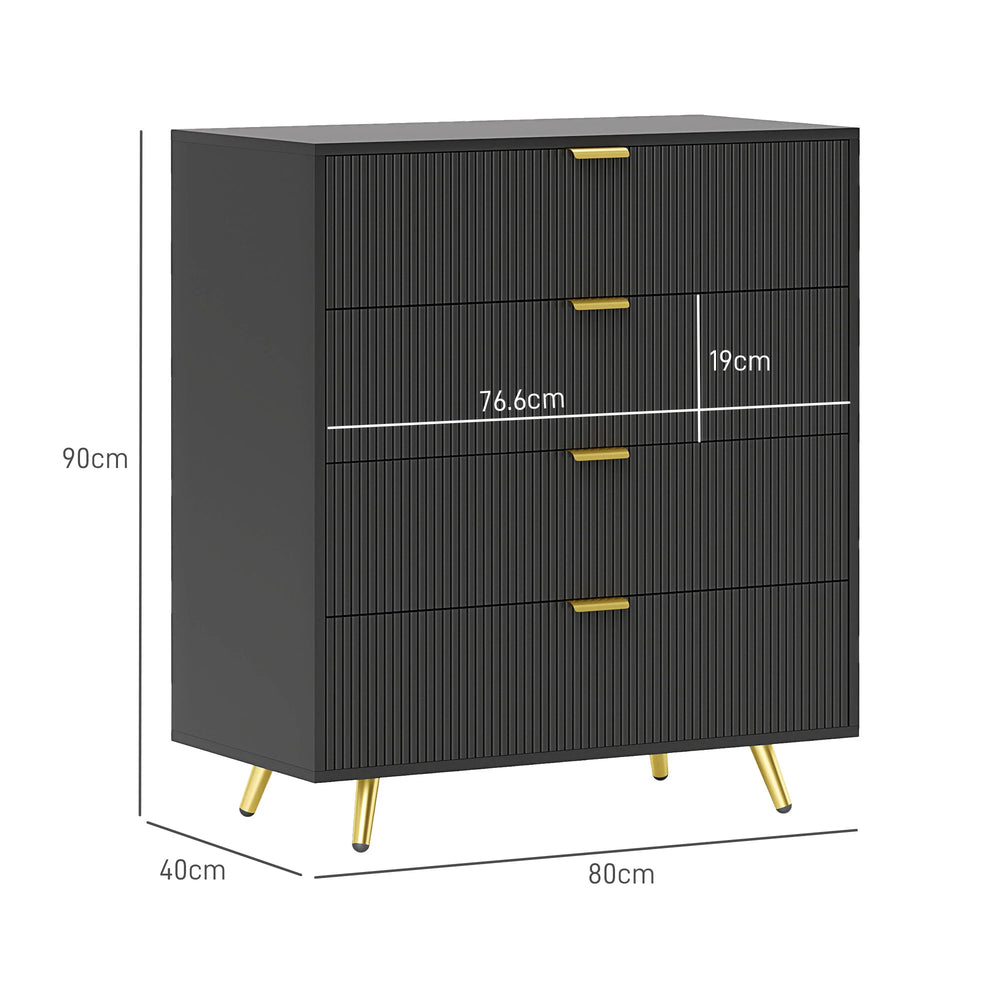 A bedroom essential, in bold and elegant style with this HOMCOM small chest of drawers. The ridged drawer fronts and gold tone handles add a beautiful touch to the solid colour. With four drawers and a flat tabletop, there's lots of storage for clothing and more; each drawer holds approx. ten T-shirts or five pairs of jeans. Complete with a metal legs for strong support.