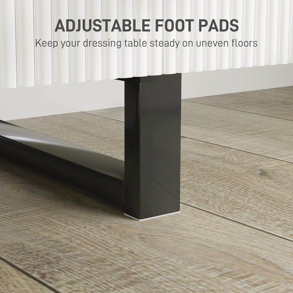 - Built to last: Crafted with a robust metal frame, this makeup desk includes anti-tipping straps and adjustable foot pads for stability, complemented by melamine faced particle board and treated MDF panels