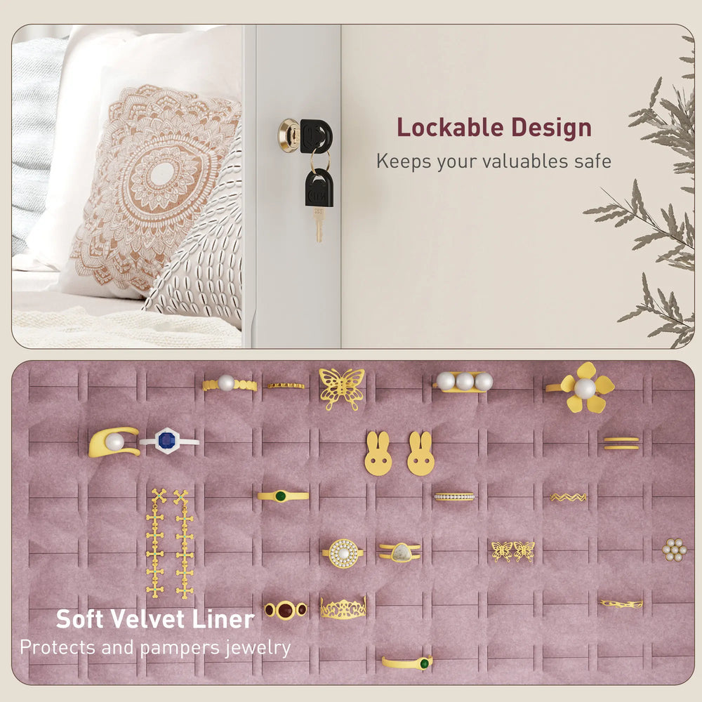 - Lockable multi-storage design: Inside of jewellery cabinet has 80x earring slots, 90x stud holes, 24x necklace hooks, 78x ring slots, three bracelet rods and more. Room for keeping everything in one place. Lock for security, with two keys included