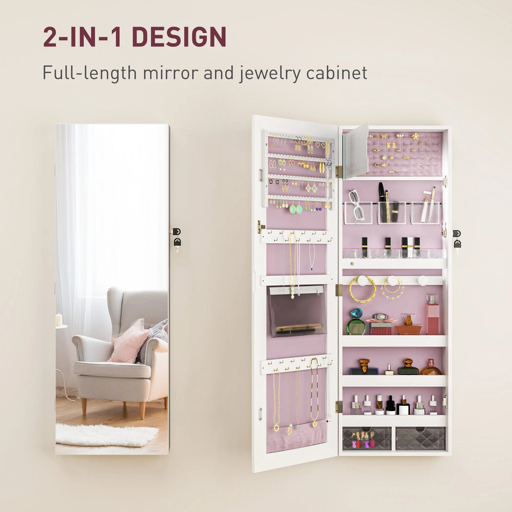 Something for every bedroom - this HOMCOM jewellery storage mirror. Keep all your jewellery, make-up and perfume together with the 80x earrings slots, 90x stud holes, 24x necklace hooks, 78x ring slots, three bracelet rods, lipstick/make-up tool boxes, storage bags, shelves and drawers. All is secured and protected with the lockable magnetic door. Complete with a front full body mirror to see yourself fully before leaving the house.