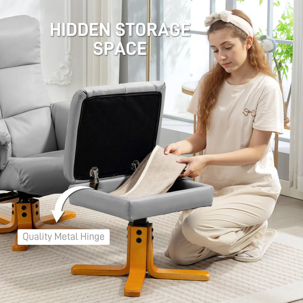 HOMCOM PU Leather Swivel Recliner Chair with Footstool, Wooden Base and Storage for Living Room, Light Grey