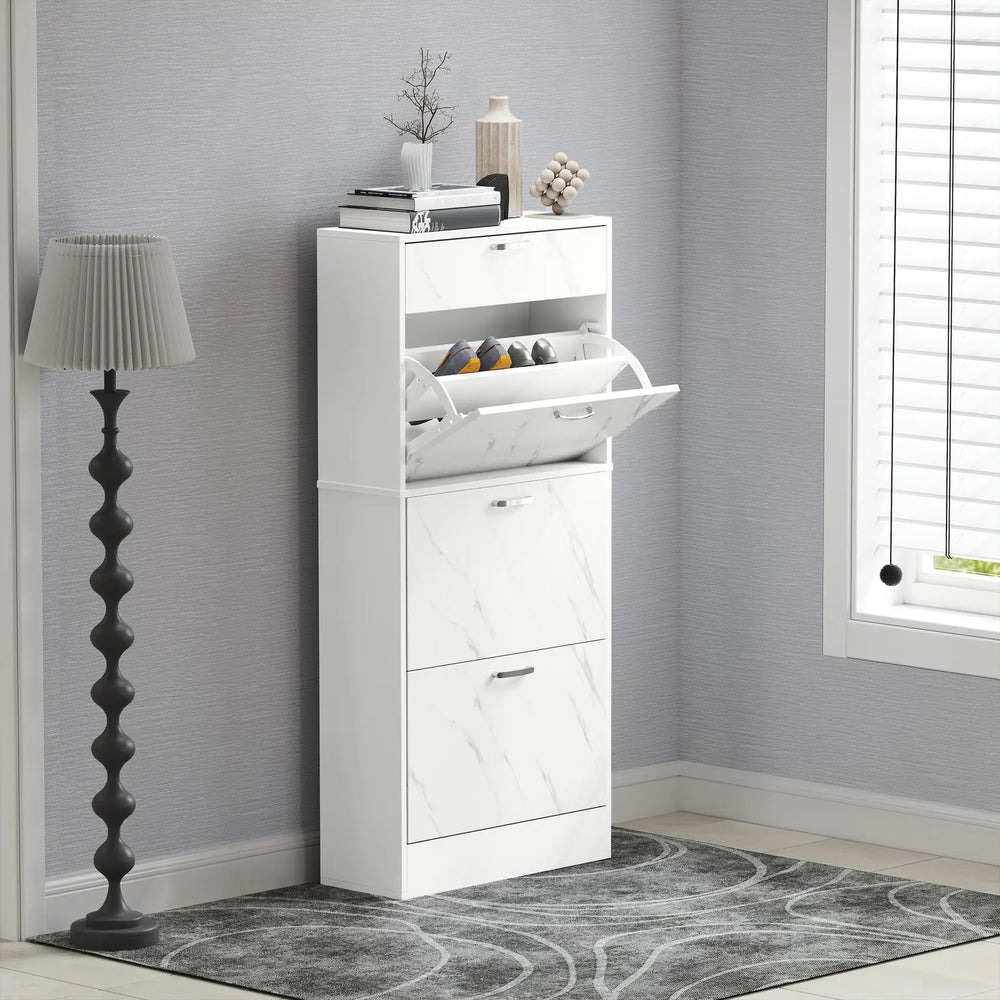 HOMCOM Marble Shoe Storage Cabinet with 3 Flip Drawers, Hallway Cabinet with Top Drawer and Adjustable Shelves, Shoe Cupboard for 18 Pairs, White
