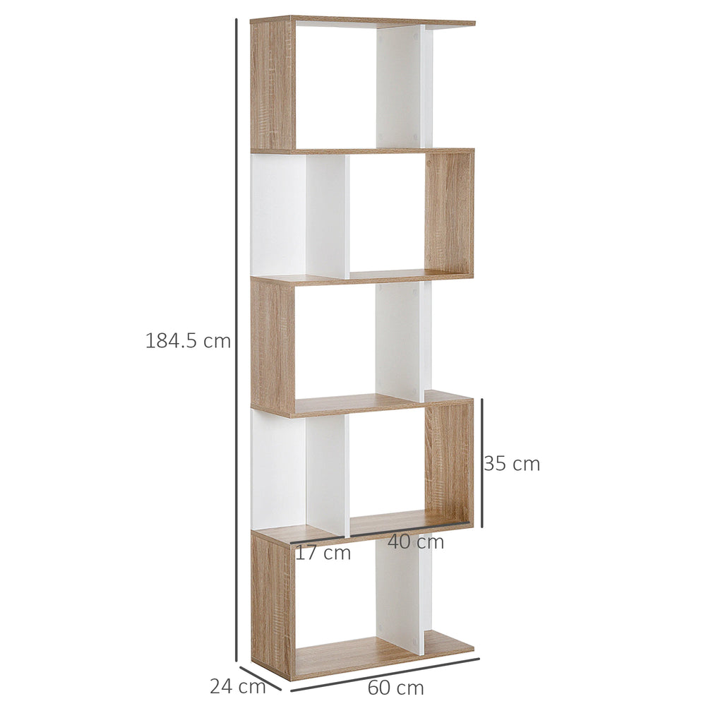 HOMCOM Bookcase, S-Shaped Wooden Bookshelf, 5/6 Tiers Freestanding Storage Shelf, Home Office Decorative Display Stand Rack, Oak and White, 24D x 60W x 184.5H