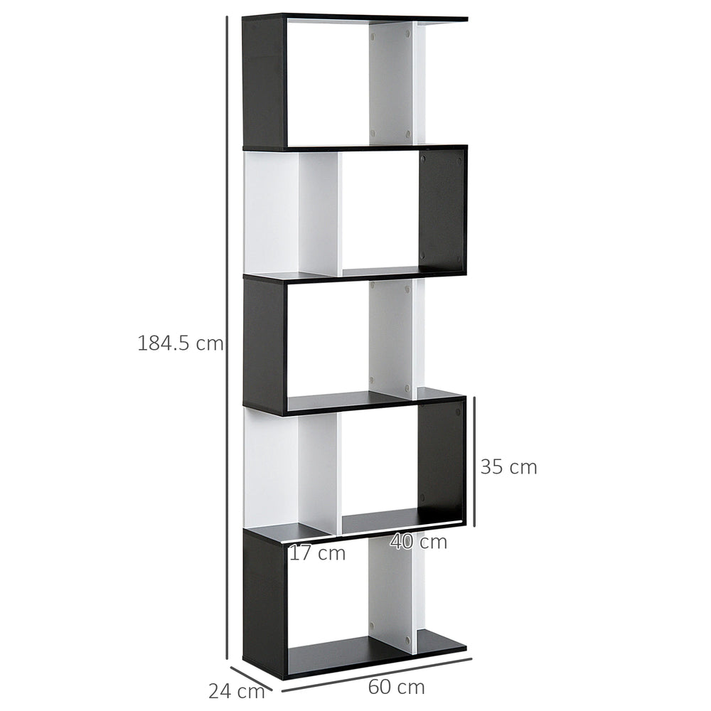 HOMCOM Bookcase, S-Shaped Wooden Bookshelf, 5/6 Tiers Freestanding Storage Shelf, Home Office Decorative Display Stand Rack, Black and White, 24D x 60W x 184.5H