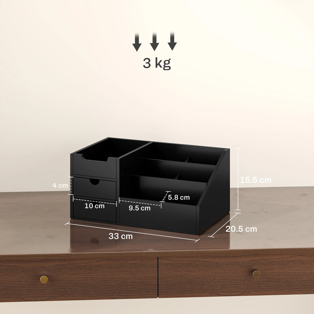 Tired of having your desk look like a total mess? This HOMCOM bamboo desk organiser is your great choice. A practical and elegant way of keeping your working surface clean and your accessories at hand. With 2 drawers and a total of 7 compartments, this rack has lots of space for your office supplies and accessories. It is built for long-lasting use.
