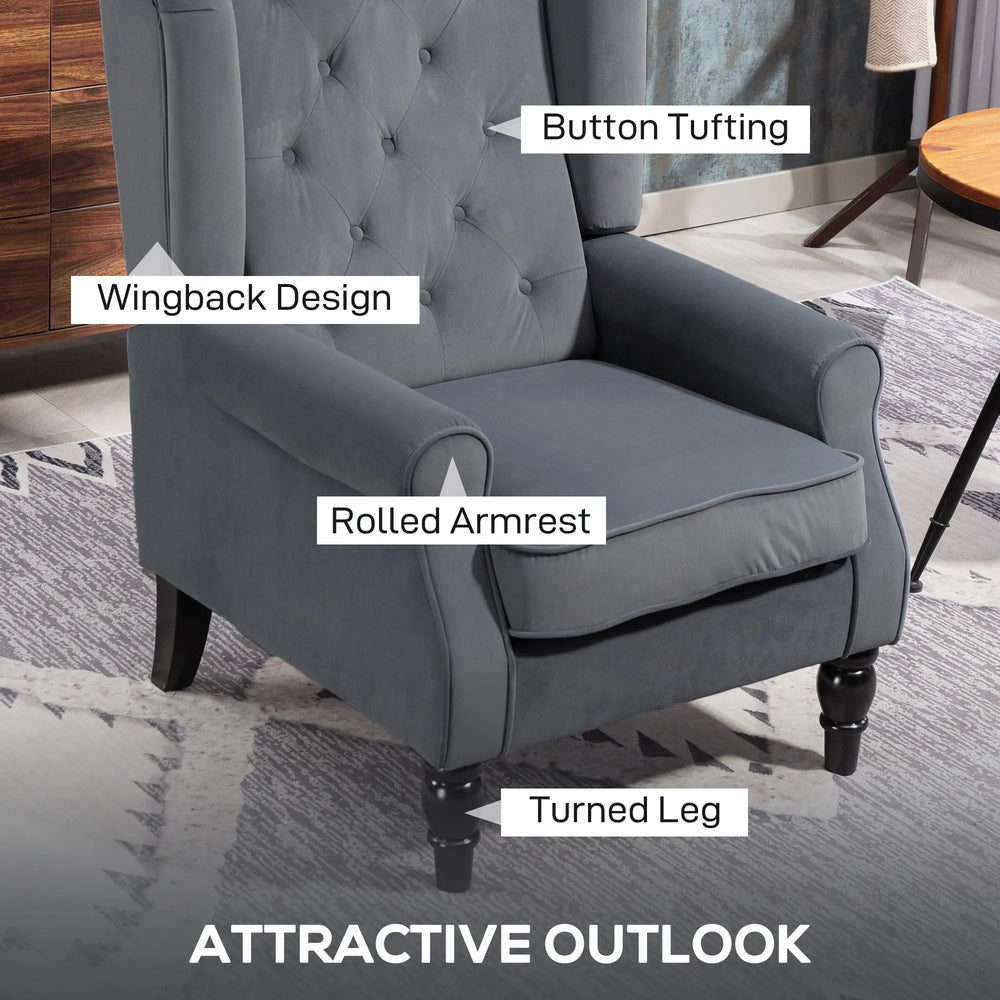HOMCOM Wingback Accent Chair, Retro Upholstered Button Tufted Occasional Chair for Living Room and Bedroom, Grey