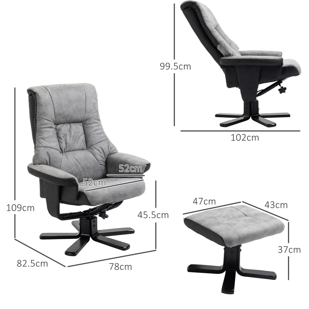 Sink into double the comfort with armchair and footstool duo from HOMCOM. Shaped into a large size, the swivel recliner chair is covered in thick foam padding for comfort, with breathable micro fiber upholstery, in a vintage looked finish for a cool and timeless look. This swivel chair can recline back to a maximum 135 angle via the under-seat handle, making it perfect paired with the footstool.The perfect spot for your afternoon time-outs.