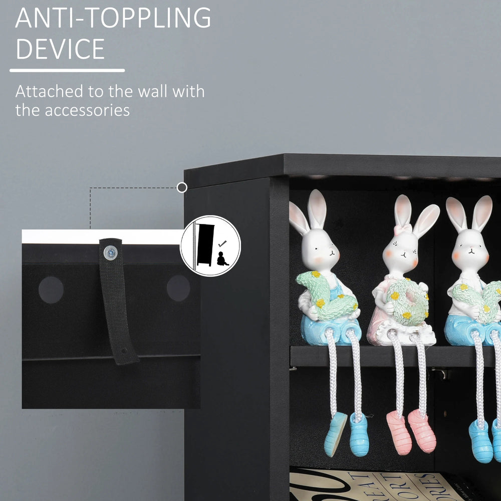 - ANTI-TIPPING: Back straps to attach to the wall - safe for homes. DIMENSIONS: 88.5H x 21W x 22.5Dcm. Shelf: 12.5H x 17.5L x 17Wcm.