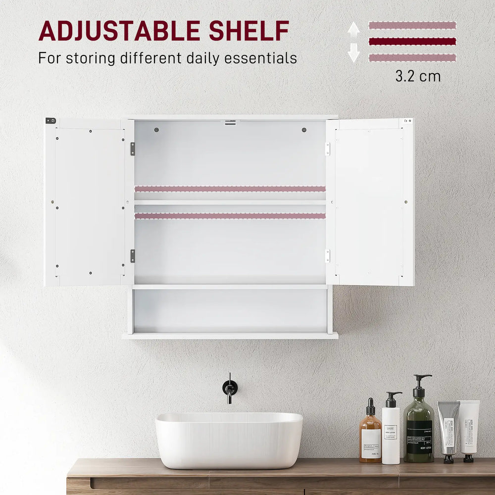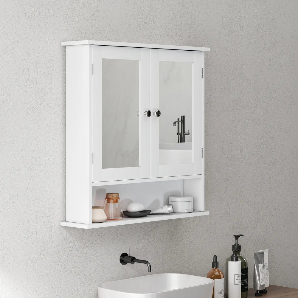 An everyday spot to get ready starts with this kleankin bathroom cabinet. As well as space to keep products, cosmetics, toiletries and more safely stored inside, it features two small front mirrors for easily getting ready. The inner adjustable shelf creates room for larger items when needed, with the bottom open shelf for even easier easy access. It's finished with polished metal door handles.