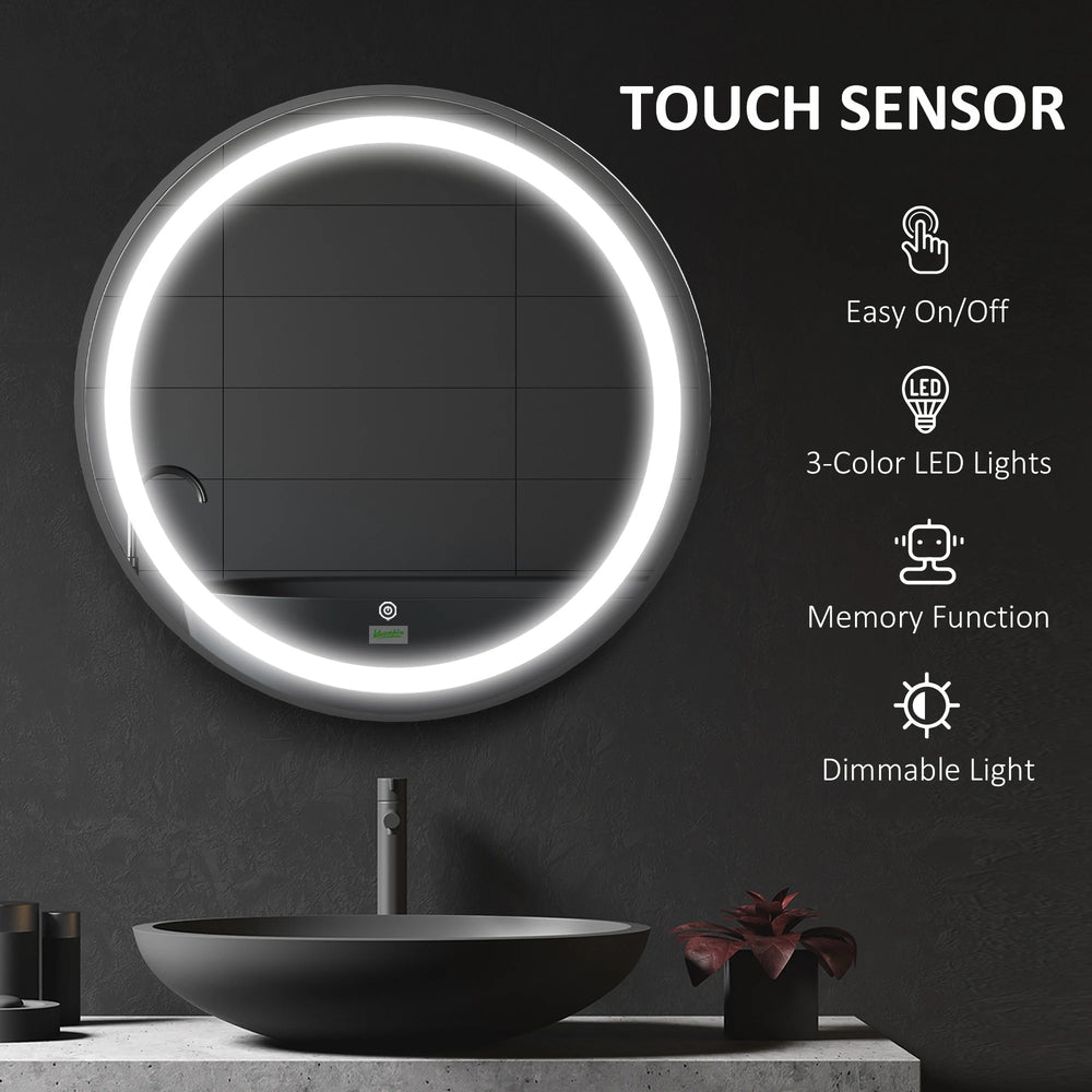 kleankin Round LED Bathroom Mirror, Dimmable Lighted Wall-Mounted Mirror with 3 Temperature Colours, Memory Function, Hardwired