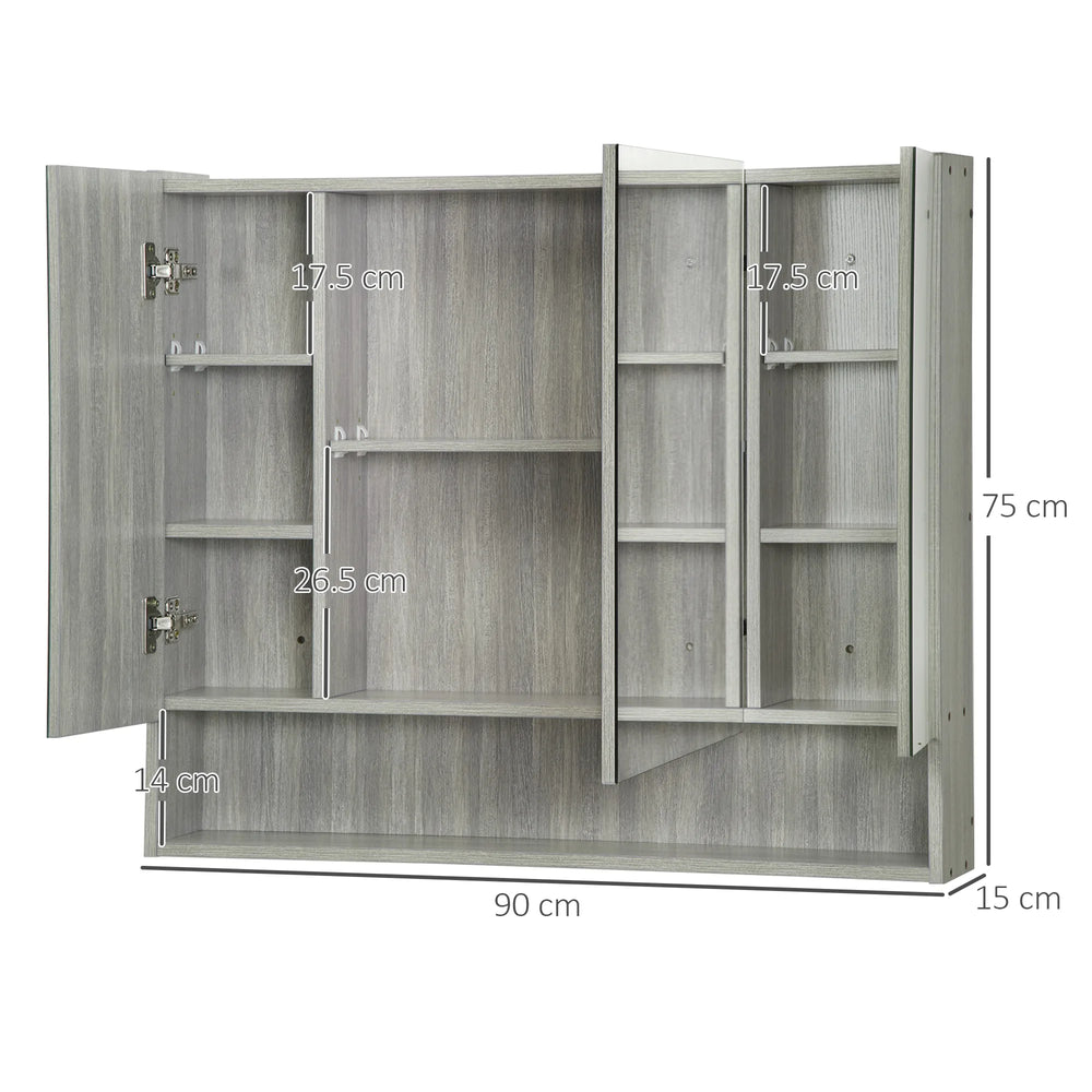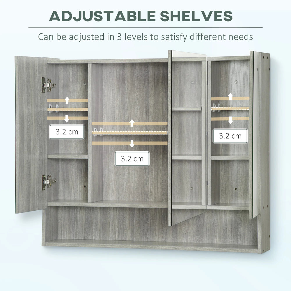 kleankin Bathroom Mirror Cabinet, Wall Mounted Storage Cabinet with Adjustable Shelves, 3 Doors and Cupboards, Grey