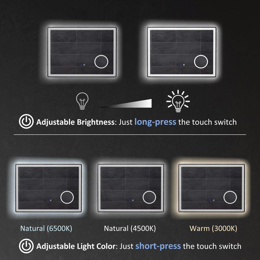 - Touch switch, with memory function: Control this bathroom wall mirror with just a tap - turns on/off, changes light colour and brightness, as well as defogging the glass. Memory will save the last setting.