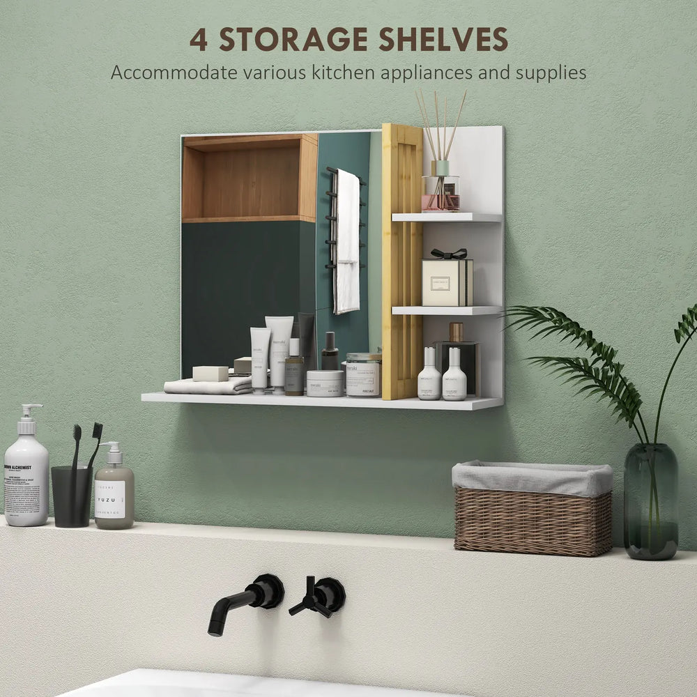 HOMCOM Bamboo Panel Bathroom Mirror, with Shelves - White