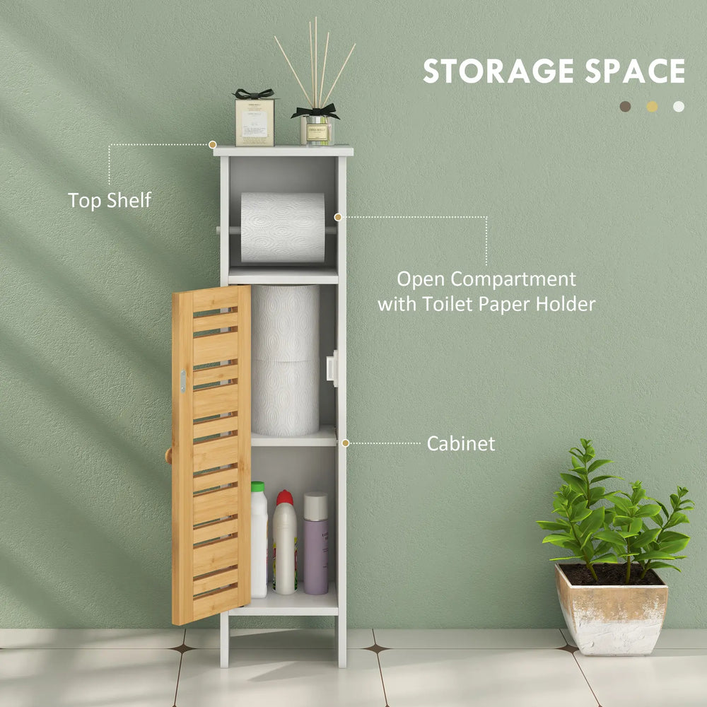 Maximise your bathroom space with the sleek HOMCOM bathroom cabinet. This bathroom storage cabinet features a handy top shelf and a middle compartment complete with a toilet paper holder. The lower cabinet boasts a three-level adjustable shelf, ensuring all your essentials are neatly organised. The slat door allows air circulation to avoid mold growth. Its tall, slim design and painted frame add a touch of elegance to any bathroom.
