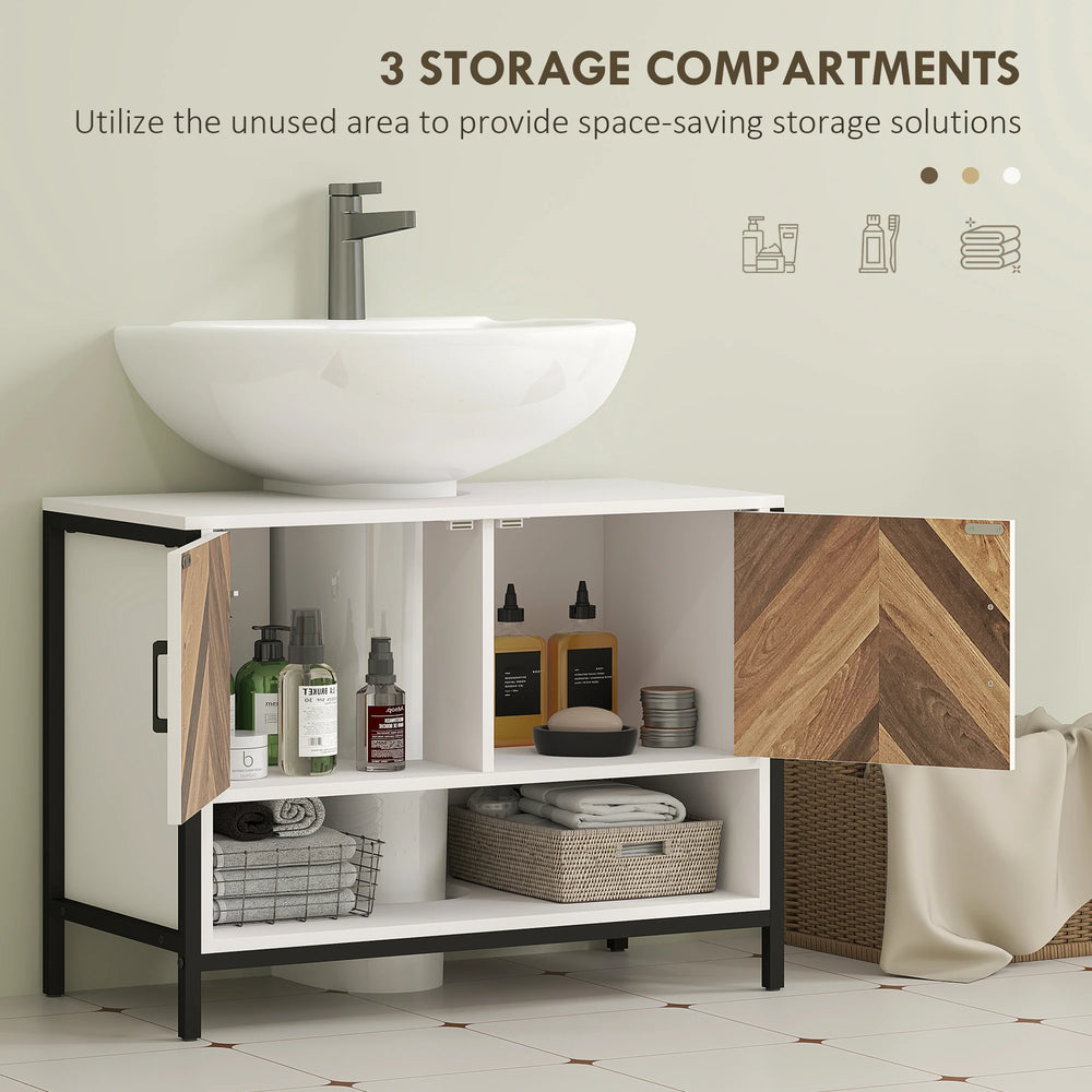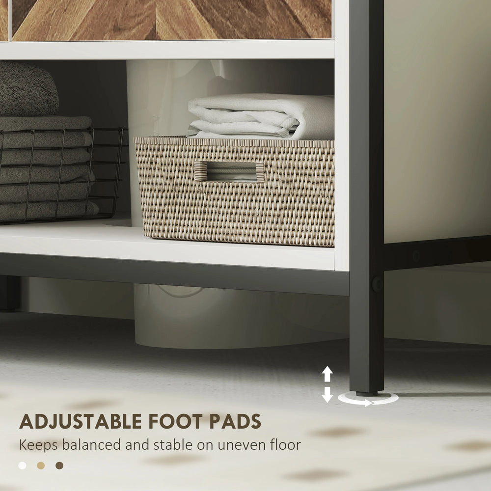 Maximise your bathroom's potential with the stylish bathroom sink cabinet from HOMCOM. Its clever U-shaped slots accommodate both pedestal and non-pedestal washbasins. Enjoy organised bliss with a neatly divided storage space, all wrapped up in a charming cream and rustic herringbone facade. HOMCOM under sink unit is a smart solution for any bathroom under sink storage needs.