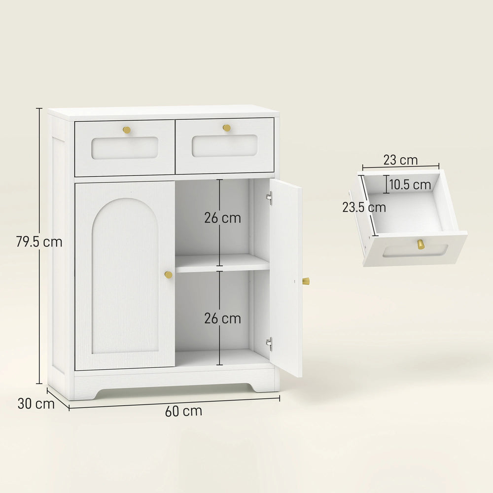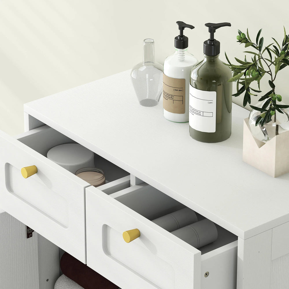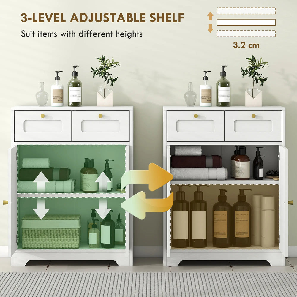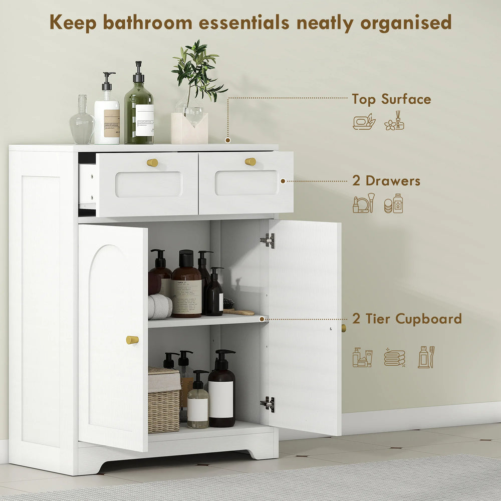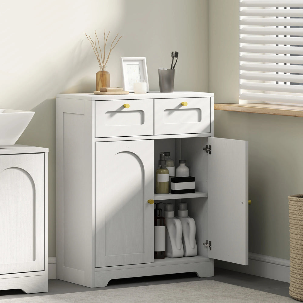 Bring calm and order to your bathroom with this stylish floor cabinet from HOMCOM. Whether it's storing spare towels, skincare, or cleaning essentials, the mix of drawers and a roomy cupboard keeps everything tucked neatly away. The adjustable shelf makes it easy to fit taller bottles, while the strong build supports up to 55 kggreat for daily family use. Finished in soft white with arched doors and gold-tone touches, the bathroom storage unit adds a gentle, classic charm to your space.