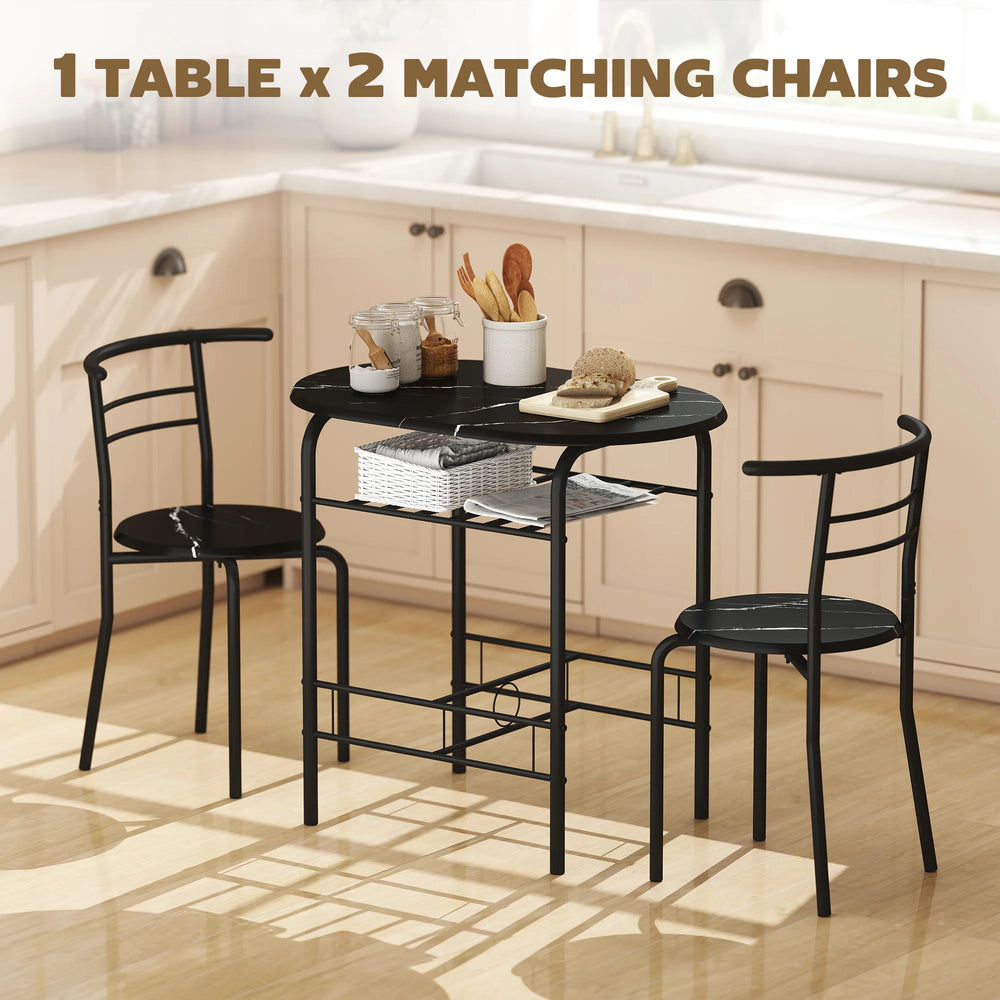 For all spaces is this HOMCOM three-piece dining set. With two chairs and a matching table, you sit and dine with company all in one spot. The frames are metal for a strong core, with robust MDF tabletops: the marble-effect design is beautiful. Set is complete with a small shelf under the tabletop, to hold tableware and kitchen accessories.