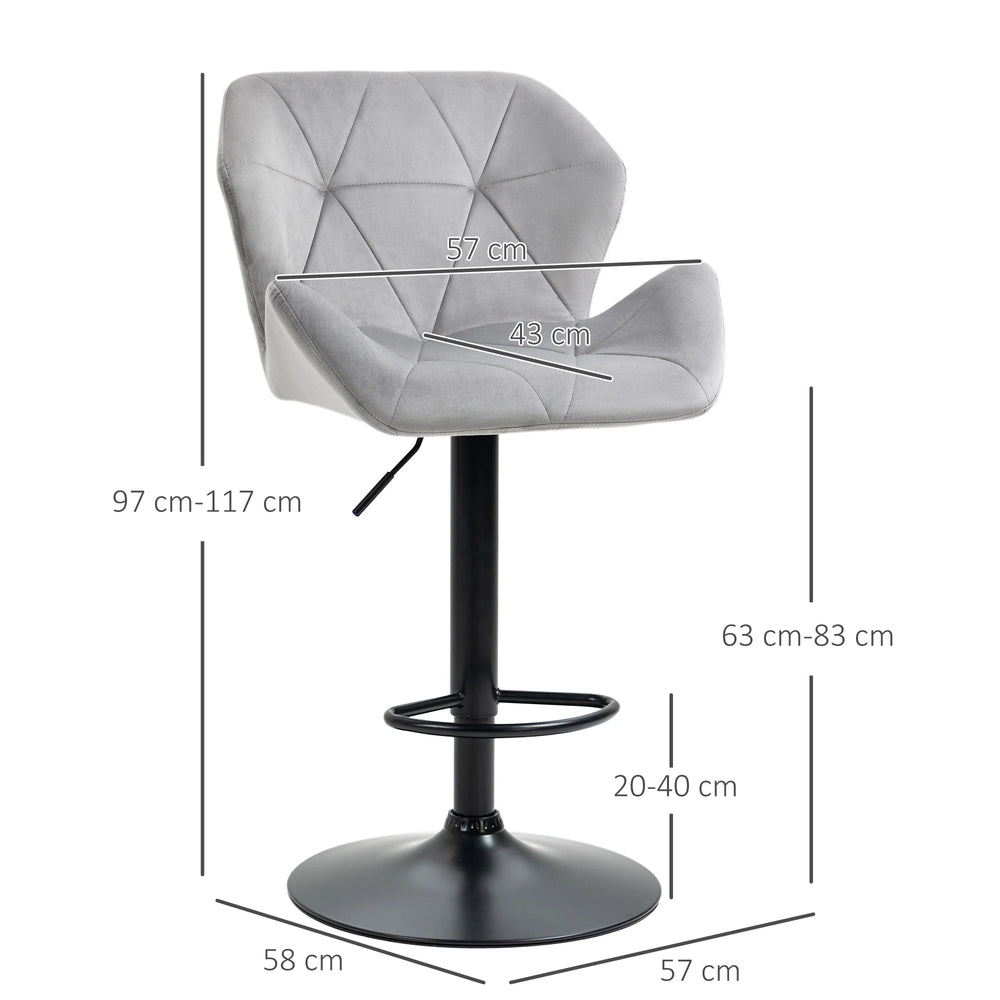 HOMCOM Bar Stools Set Of 2, Luxurious Velvet-Touch Barstools with Metal Frame Footrest Round Base Triangle Indenting Moulded Seat Adjustable Height Swivel Grey