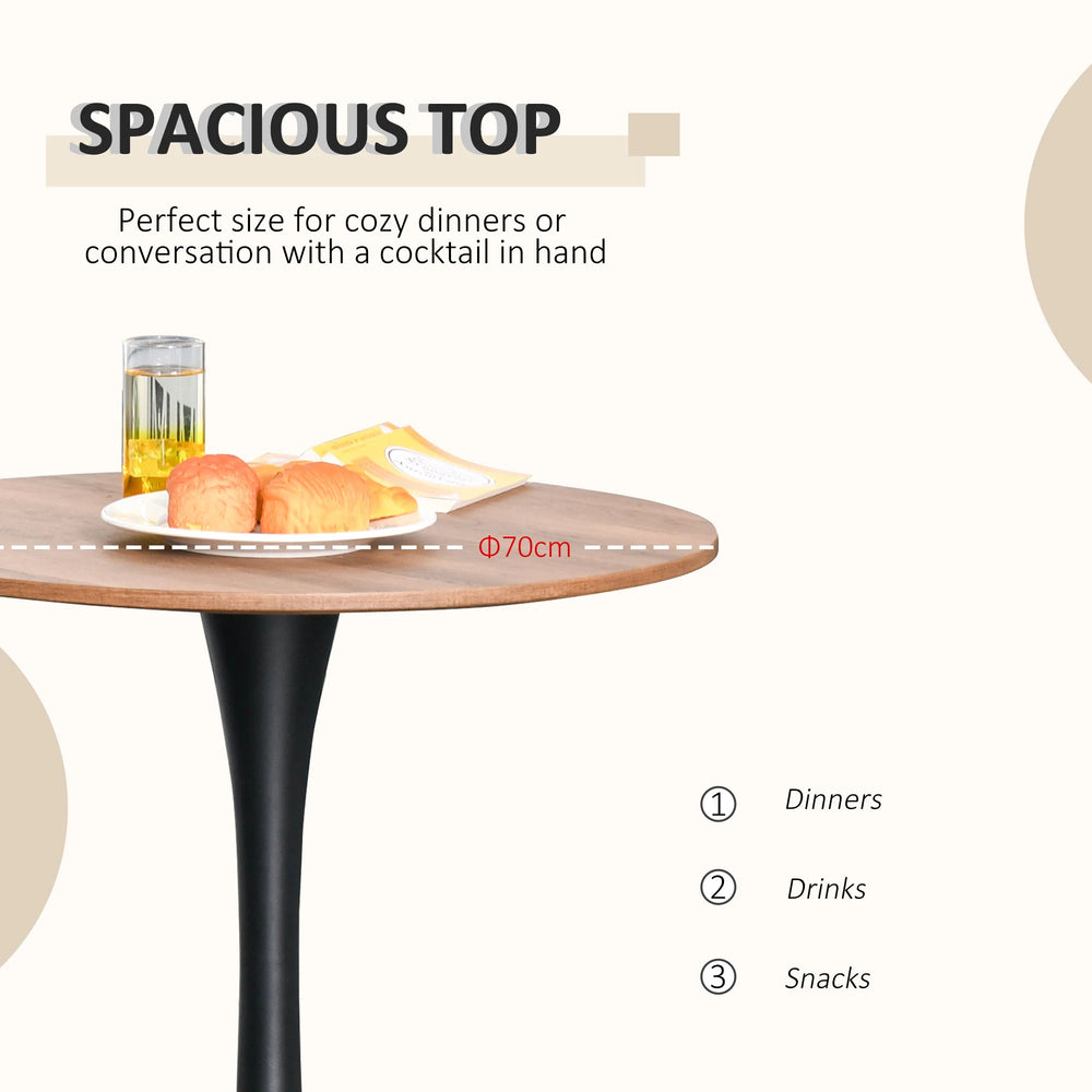 Bring upmarket bar vibes into the home with this dining table from HOMCOM. The frame, made from metal for a strong base, is crafted into a smoothly curved hourglass shape, giving it a beautiful look and feel. A large round table top is fitted on the frame, giving you a safe and reliable holding place for glasses, plates and more. Covered in a brown wood effect finish for a classic look which complements almost any interior, it's finished with a round base to promote balance and a bottom pad to protect the floor.
