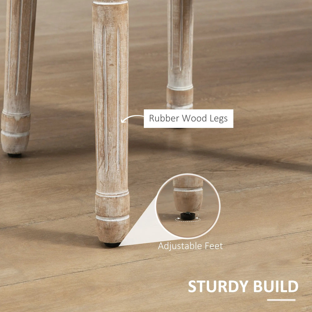 French inspired elegance for the home, with these two HOMCOM dining room chairs. Both frames are made from wood for strength, with the oval backs and fluted legs adding to the look. The thick sponge back and seat panels keep you comfortable, covered with smooth linen-look upholstery. Complete with adjustable feet for balance.