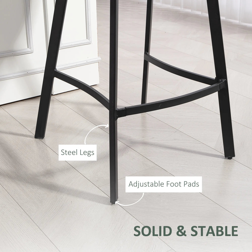 Accent your home bar area with these two HOMCOM kitchen stools with backs. Faux leather upholstery is smooth and stylish. The frame, made from powder coated steel, is strong and supports you when seated. Attached adjustable foot pads to keep these barstools standing steady and balanced, at all times.