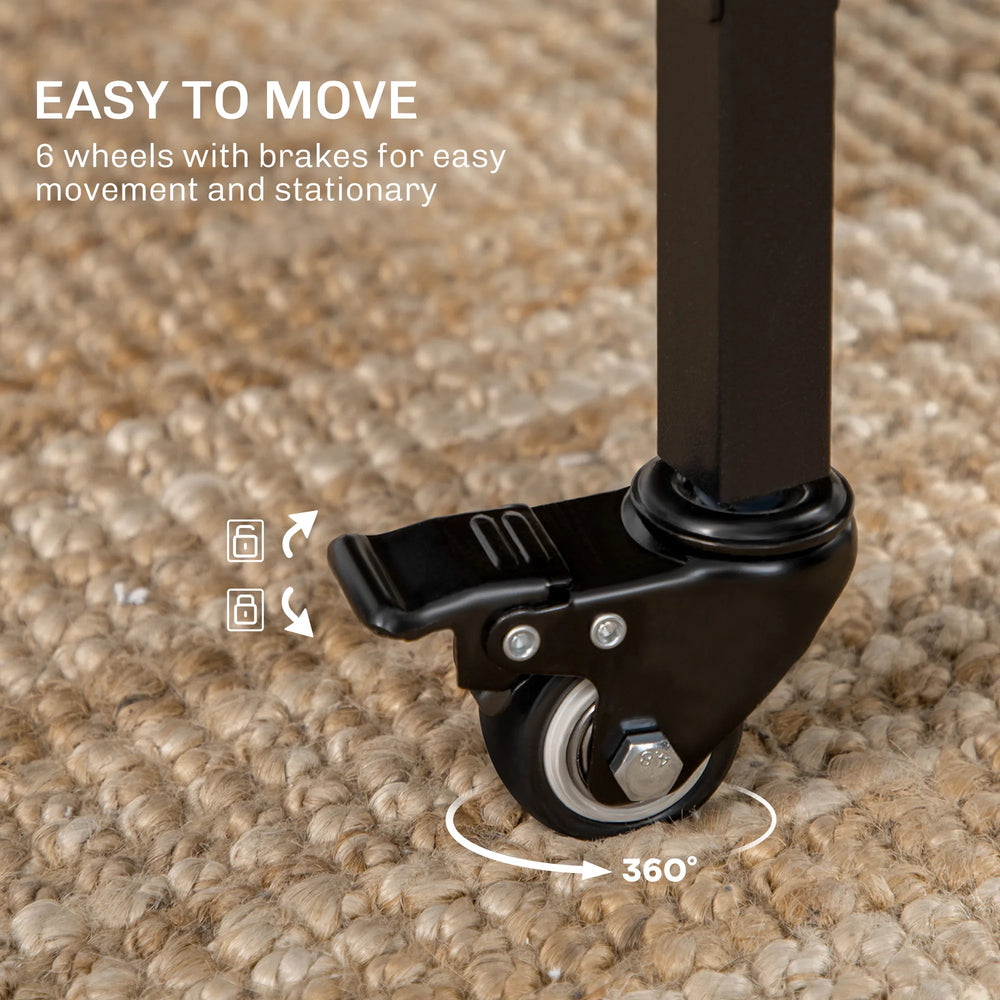 - Six wheels on the bottom for easy movement. Six brakes to lock into place