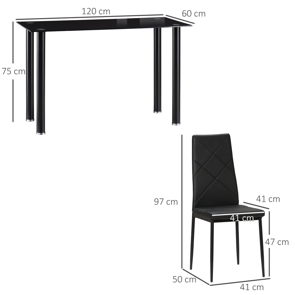 Any space made into a gathering space. This HOMCOM five-piece dining set comes with a table and four matching chairs - compact in size so it's suitable for smaller spots. A glass tabletop for a polished look, the surface provides a solid dining surface which can be wiped clean easily. Each chair is thickly padded for comfort, with smooth and stylish faux leather upholstery. When empty, you can tuck the chairs snuggly underneath the table for a compact size.