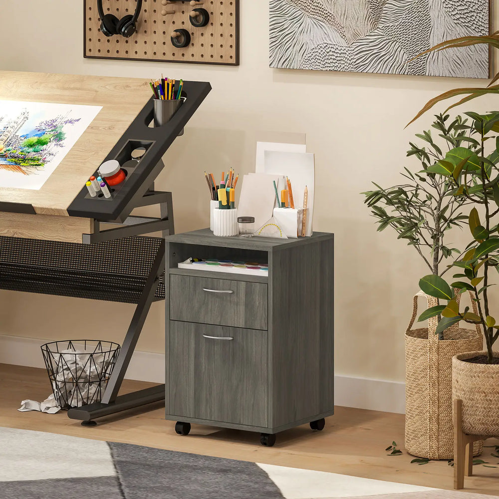 HOMCOM 60cm Filing Cabinet with Drawer, Open Shelf, Metal Handles and 4 Wheels, Office Home Organiser Mobile Printer, Grey