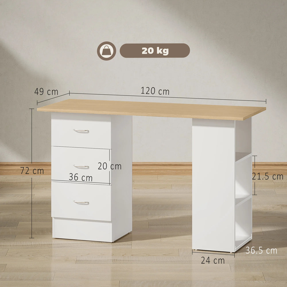 Maintain a contemporary and minimalistic workspace using HOMCOM's desk with drawers. Crafted from MDF, this study table showcases a clean boxy design in a neutral colour, suitable for various home office environments. It offers three enclosed drawers and three open shelves, providing a balanced solution for work essentials and decor. The drawers feature convenient handles for a polished finish.