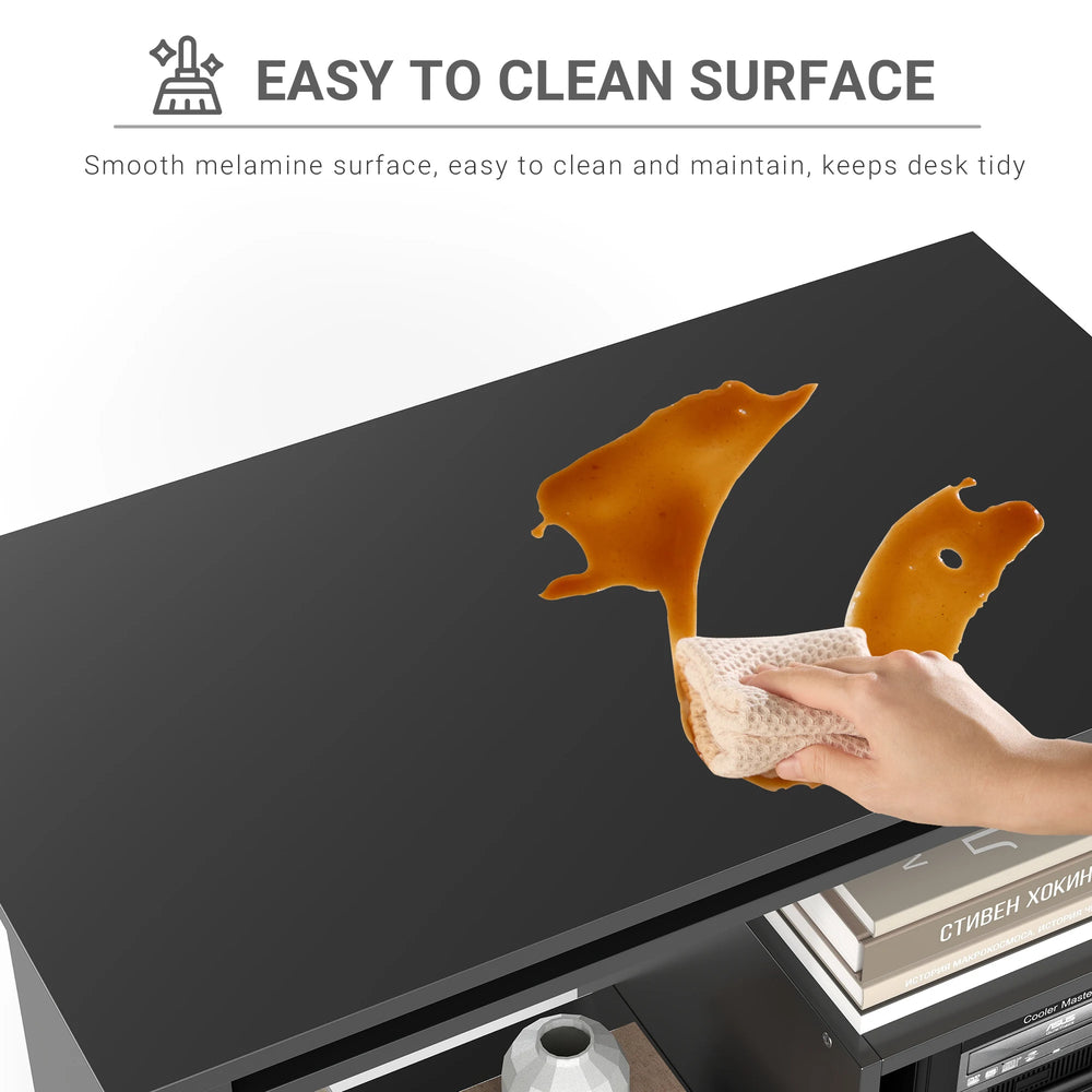 Transform your small space into a professional home office with this compact computer desk, designed for efficiency and style. Crafted from thick particle board with a sleek finish, it offers a spacious worktop, a slide-out keyboard tray, a CPU stand, and two open storage shelves, maximizing functionality without compromising on space. The smooth, non-scratch melamine surface ensures easy maintenance. Perfect for creating a productive environment in any corner of your home.