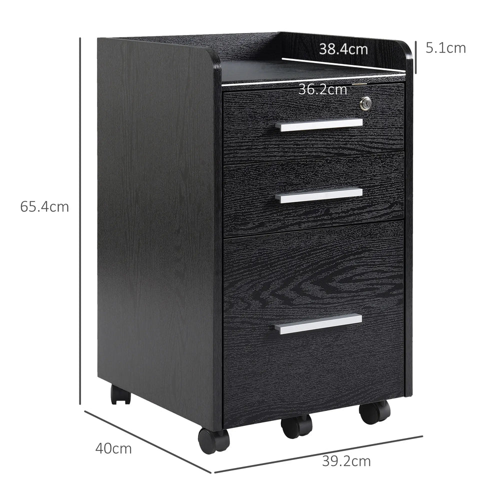 Keep workspace files tidy and secure with this HOMCOM wood-effect lockable filing cabinet. It has three drawers to hold papers, boxes, files and stationery, with a lockable top drawer for security. A compact size which slots under desks easily, it is complete with five wheels to move around easily - please two brakes for security.