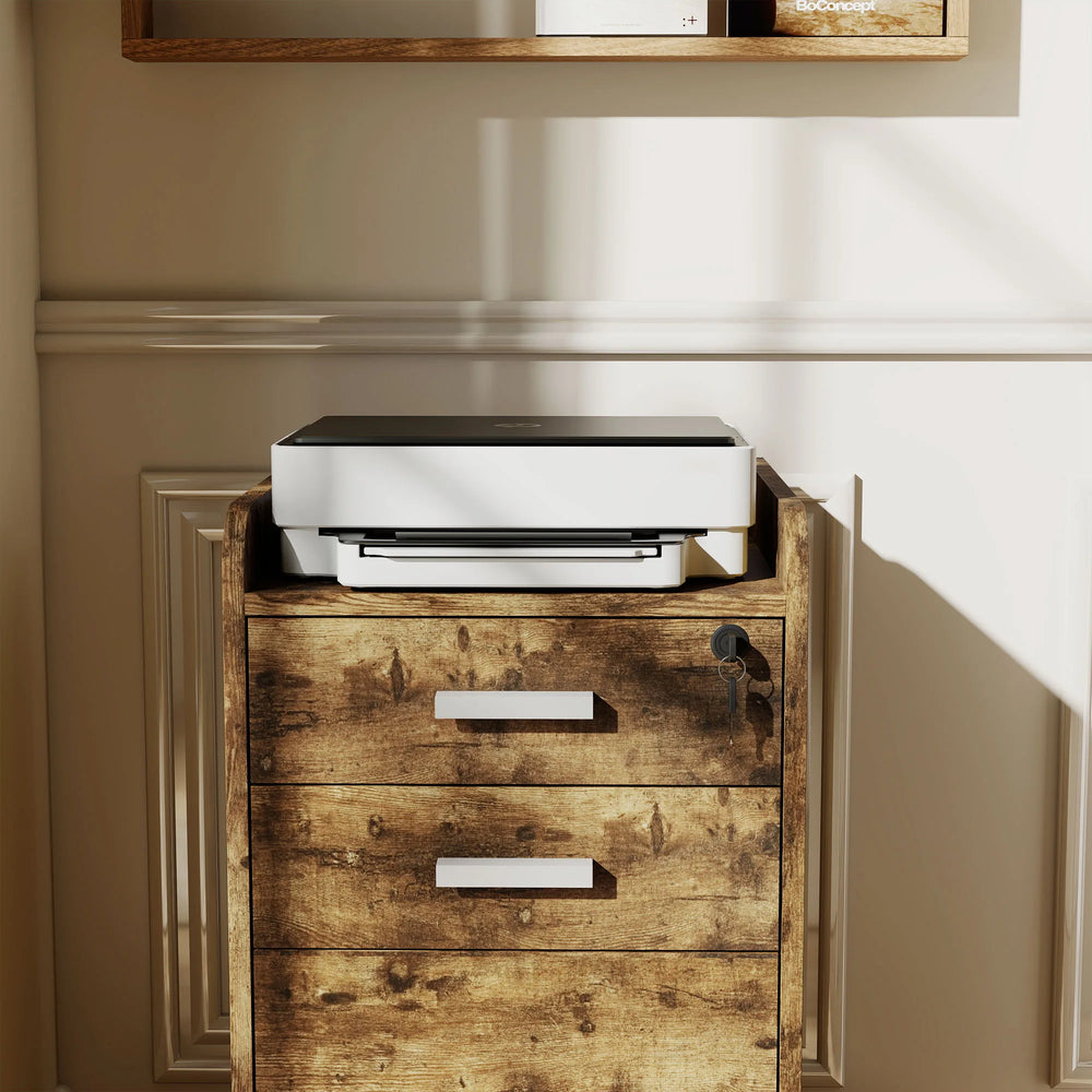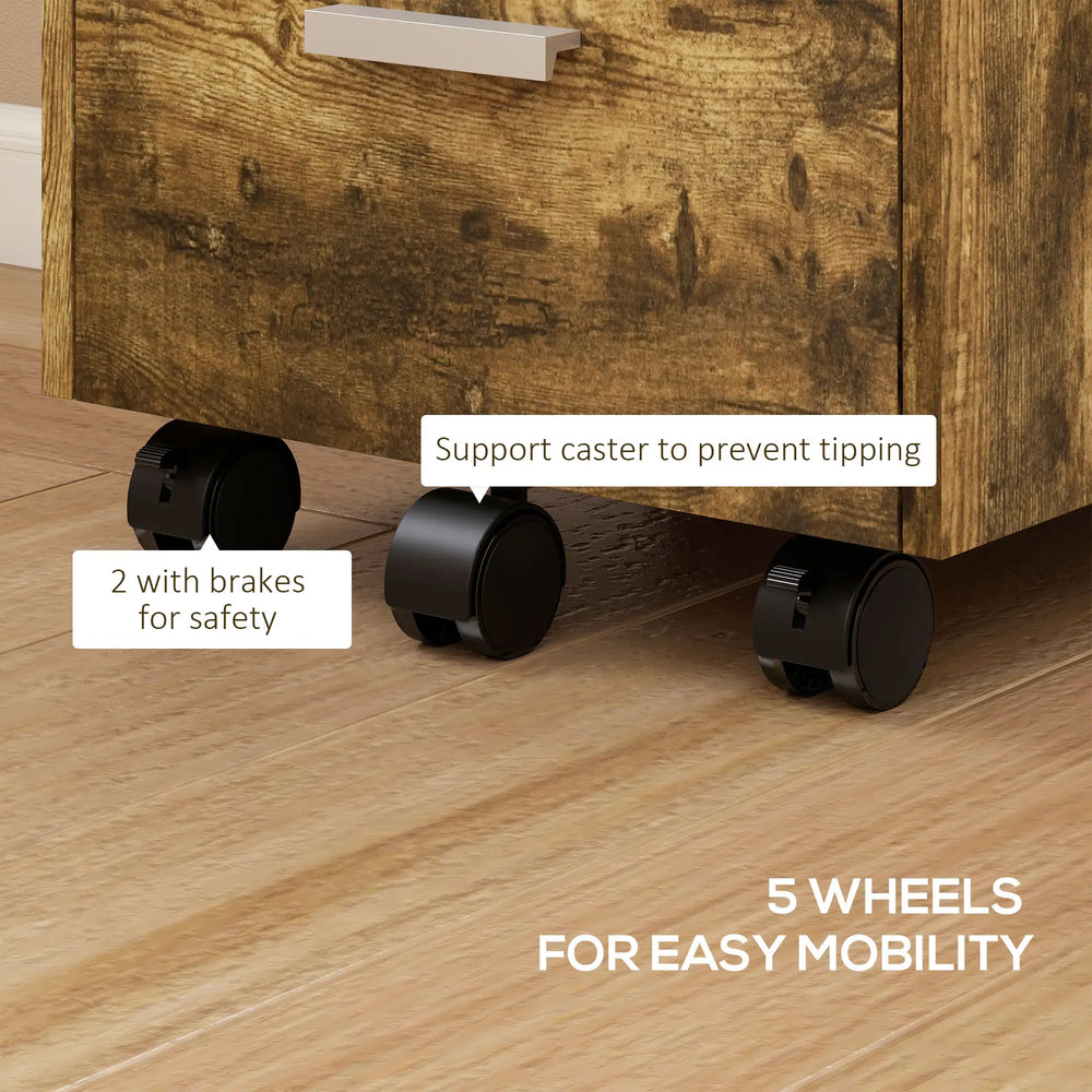 Keep workspace files tidy with this HOMCOM wood-effect filing cabinet. It has three drawers to hold papers, boxes, files and stationery. A compact size which slots under desks easily, it is complete with five wheels to move around easily - please two brakes for security. Robust MDF and particle board ensure durability for the file cabinet.