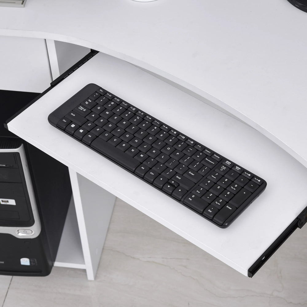 Make the most of those unused corners with this 'L' shaped desk from HOMCOM. This space-efficient piece is made with two wide shelves, an open oblong compartment, a slide-out drawer, keyboard tray and open table top - giving you lots of room needed for working from and keeping your essentials stored. It's made from particle board, meaning the structure is tough and durable so you can use it every day with confidence. It's finished with a smooth melamine coating, which keeps its surface lightly protected and makes it easy to clean. The perfect place to focus your attention all day long.