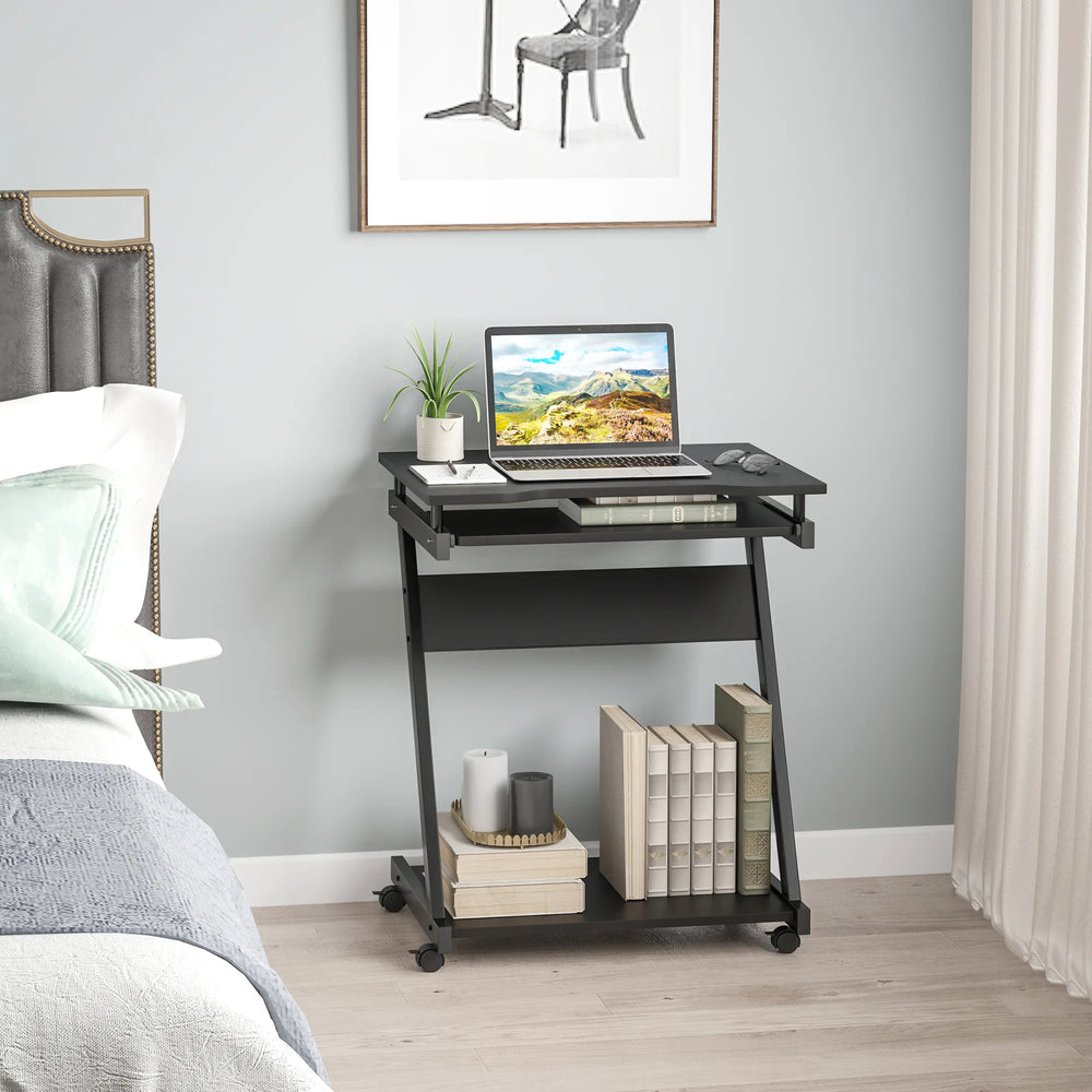 Keep your working times clean and clutter-free with this small desk for home office from HOMCOM. The frame is made of metal for a sturdy structure, crafted into a 'z' shape design which enables it to keep balanced and stable. It features an open tabletop, slide-out keyboard tray and bottom shelf, giving you plenty of room for working and storage. 4 locking wheels at the bottom, making this pc desk easy to move around and keep stationary. A modern piece perfect for all home and office spaces.