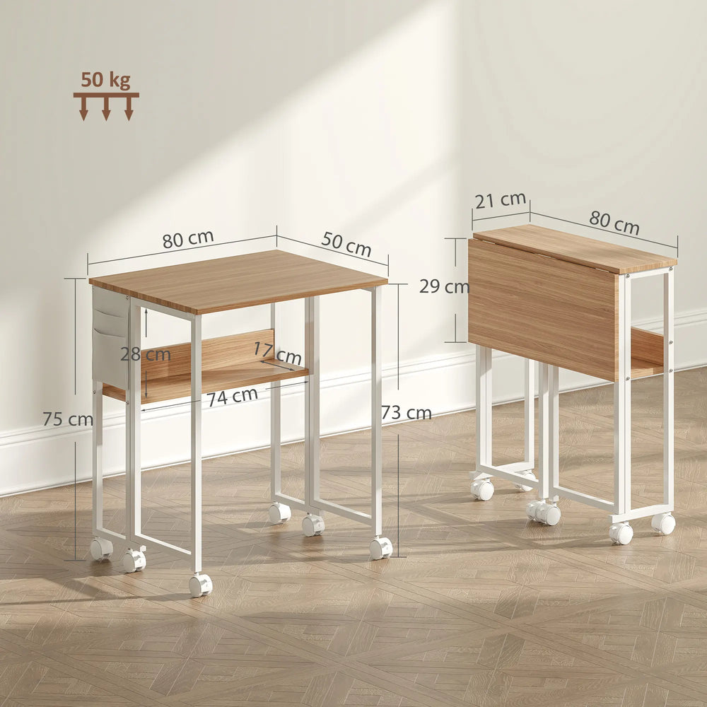 Maximise work space, even in small spaces with this HOMCOM drop leaf computer table. When folded, it is 21 cm and extends to 50 cm - plenty of room for you to work. Features a lower shelf and side bag for close-by holding space for all the essentials. Plus, you can wheel this study desk anywhere with ease, thanks to six 360 swivel casters - complete with four brakes.