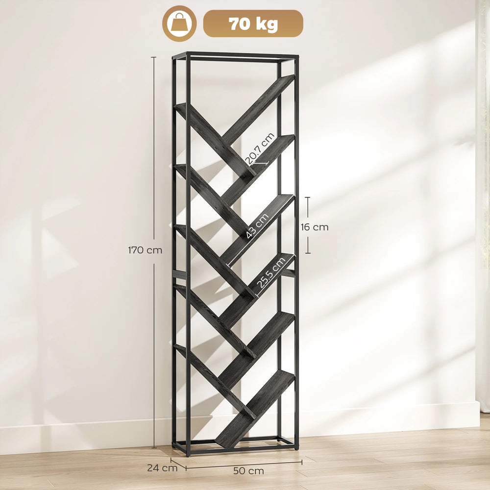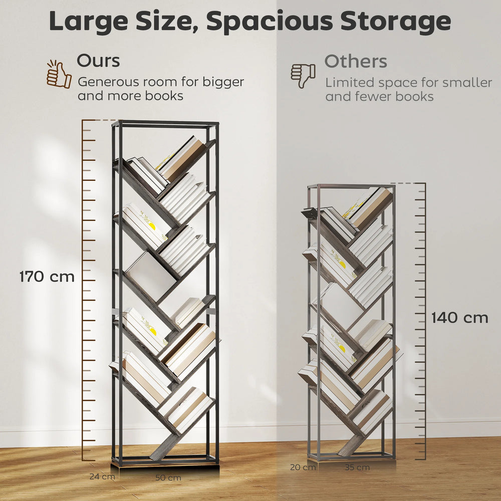 The cool, compact way to hold your book collection - this HOMCOM tree bookshelf. At 170 cm tall, it takes up just 0.12 m2 floor space, making it great for smaller spaces. It showcases ten slanted shelves - shaped like branches - to hold plenty of books. With a metal frame for a strong core, it comes with anti-tipping straps to secure in place to a wall.
