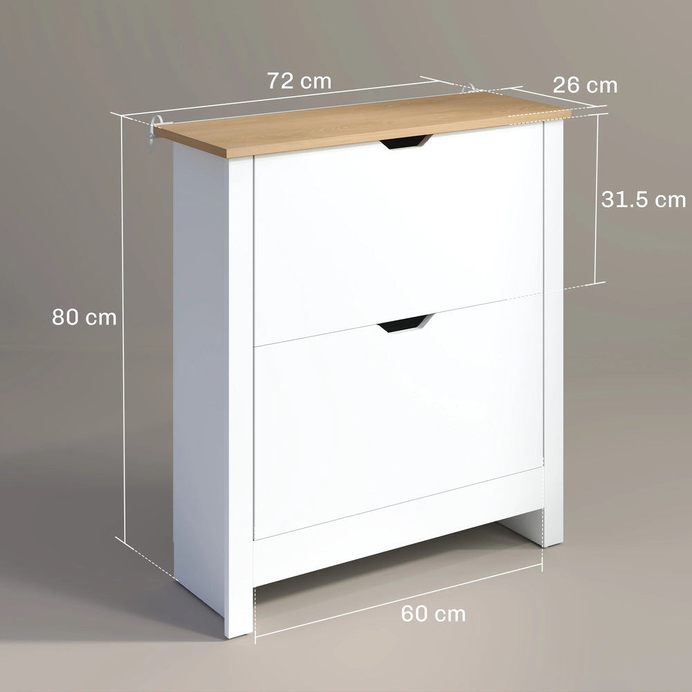 This compact shoe cabinet from HOMCOM will help to keep your home effortlessly decluttered. A particle board construction ensures a tough and solid frame, with a smooth coating so it can be cleaned easily. Each drawer features a two-level shelf - holds up to 6-12 pairs of shoes. Groove handle to open and close easily. Complete with a flat tabletop for extra holding and display space, with feet to keep the unit balanced.
