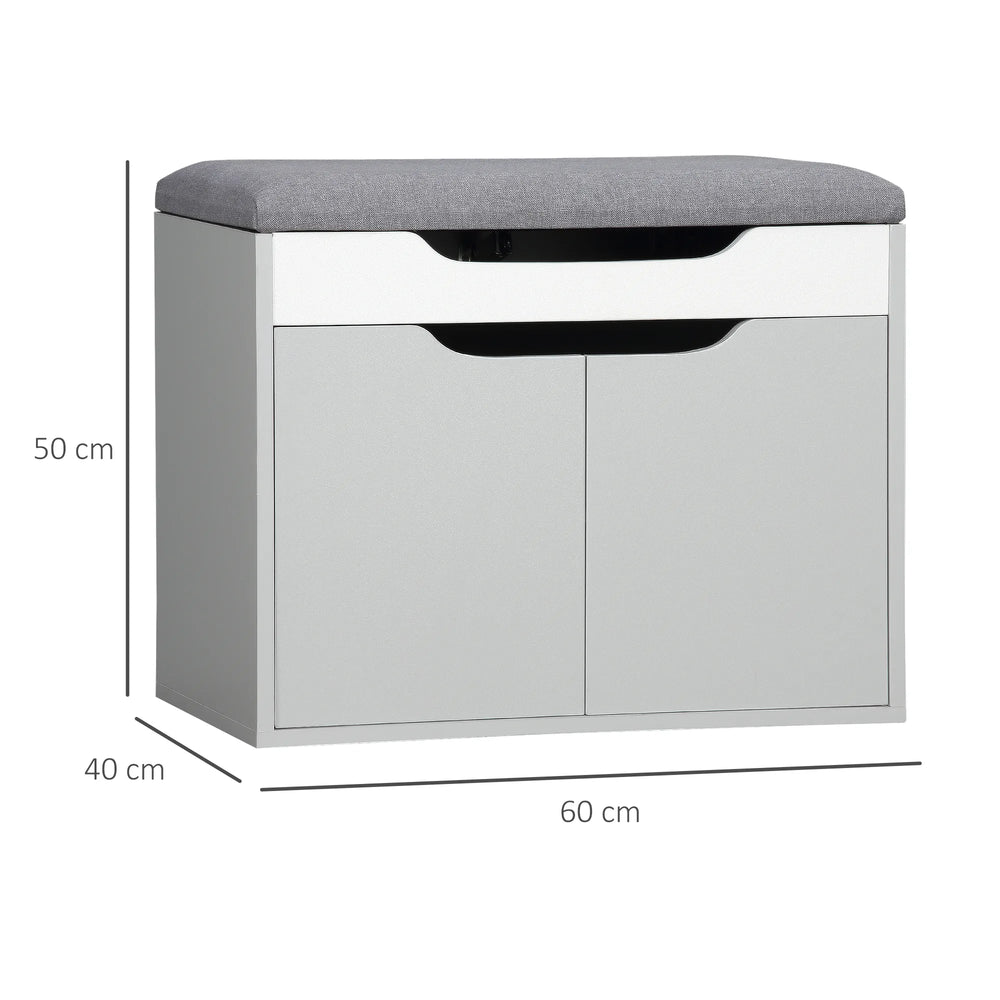 A compact and comfortable shoe storage with seat, from HOMCOM. Keep this shoe bench in your hallway for convenience when leaving and entering the house. It comes with a cupboard with adjustable shelf to keep four pairs of shoes in (approx.) It also features a small top compartment for little bits and bobs - concealed up the padded lift up lid, which also acts as a seat when putting shoes on and taking them off. Completed with handy groove handles.