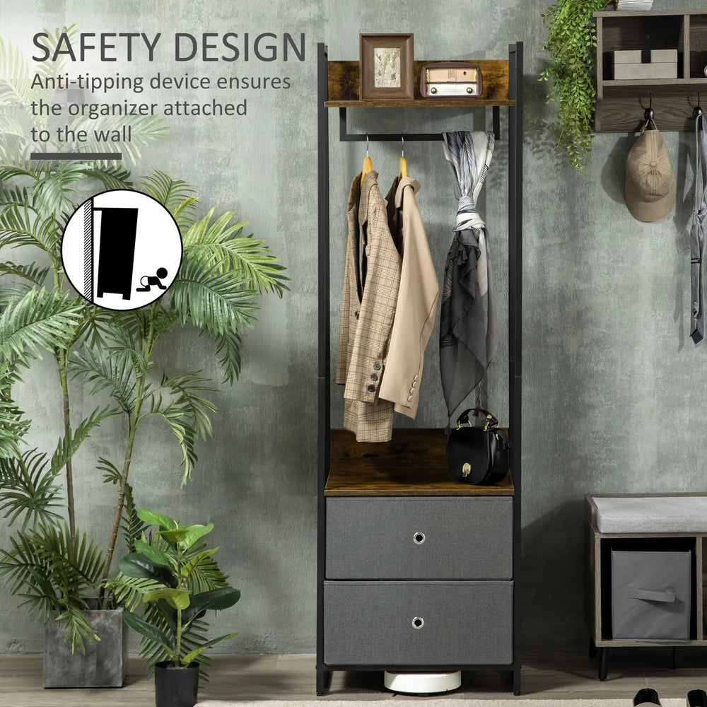 HOMCOM Clothes Rail, Metal Coat Stand, Garment Rack with 2 Fabric Storage Drawers, Single Wardrobe for Bedroom, Hallway, Rustic Brown and Grey