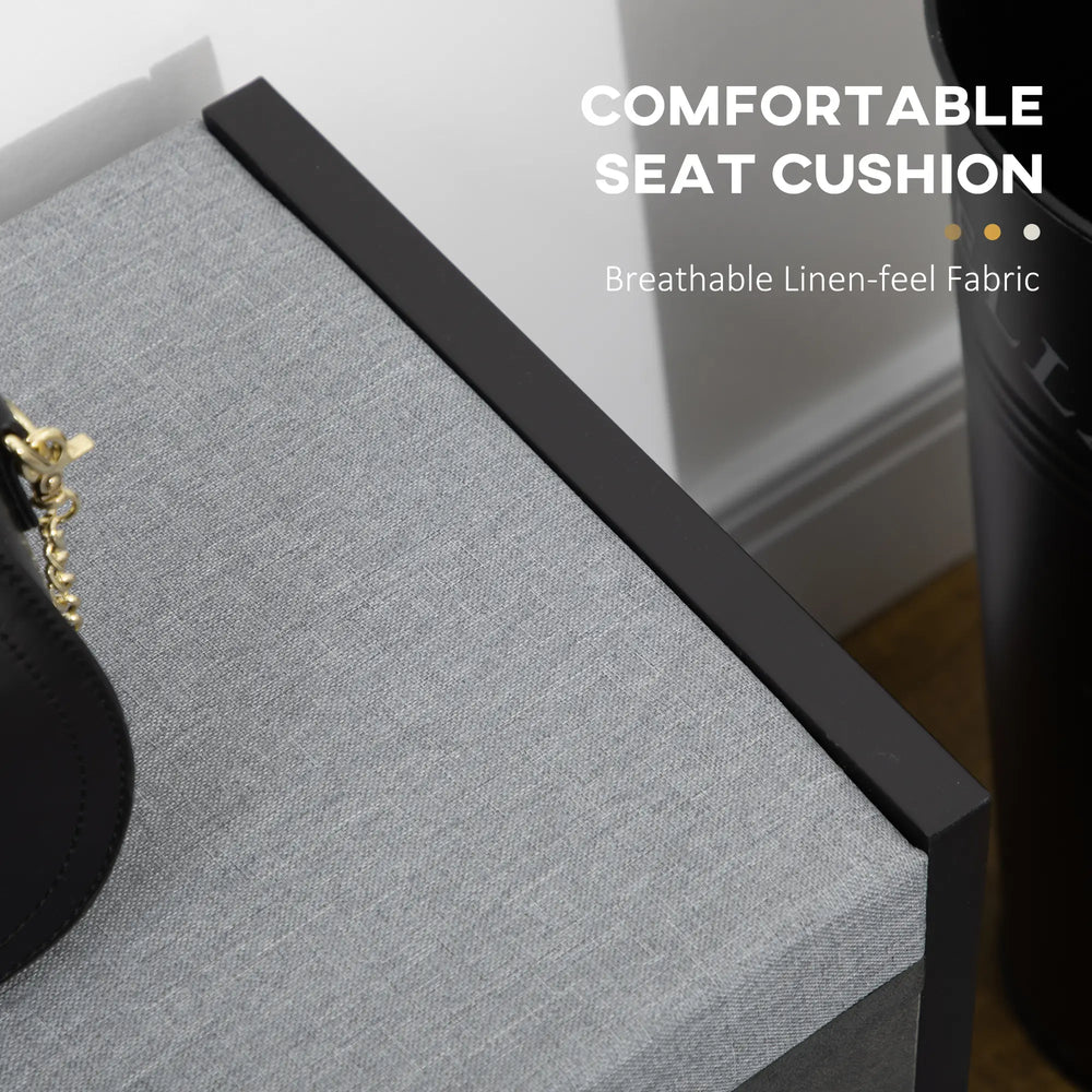 Organise footwear with our HOMCOM shoe hallway bench. With two open shelves, there's room for six pairs of your shoes, with a tall side shelf for boots; it's great for personal use. It features a top padded seat - sit comfortably for a moment as you put shoes on and take them off. With a steel frame, this shoe storage with seat has a strong, supportive core. Suitable for everyday.