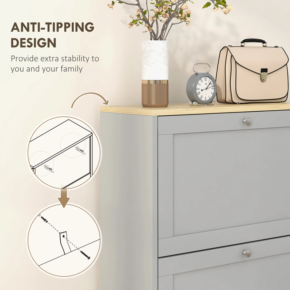 This HOMCOM shoe cabinet offers plenty of footwear storage, in a compact and stylish design. With three flip drawers, it can hold 12-18 pairs of shoes - spacious enough for individual and shared use. Each drawer has a two-level adjustable shelf to fit differently-sized shoes no problem. Shoe storage unit comes with anti-tipping hardware to safely attach to a wall; its narrow design is great for the smaller spots.