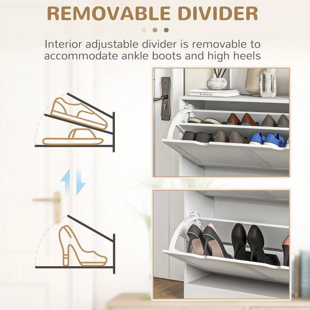 HOMCOM 2 Drawers Entryway Shoe Cabinet, Narrow Shoe Storage Cabinet with 2 Flip Drawers, Louvred Door Design and Adjustable Shelves for 16 Pairs of Shoes, White